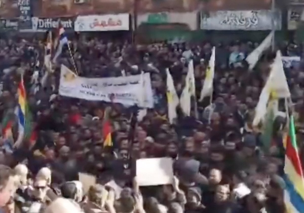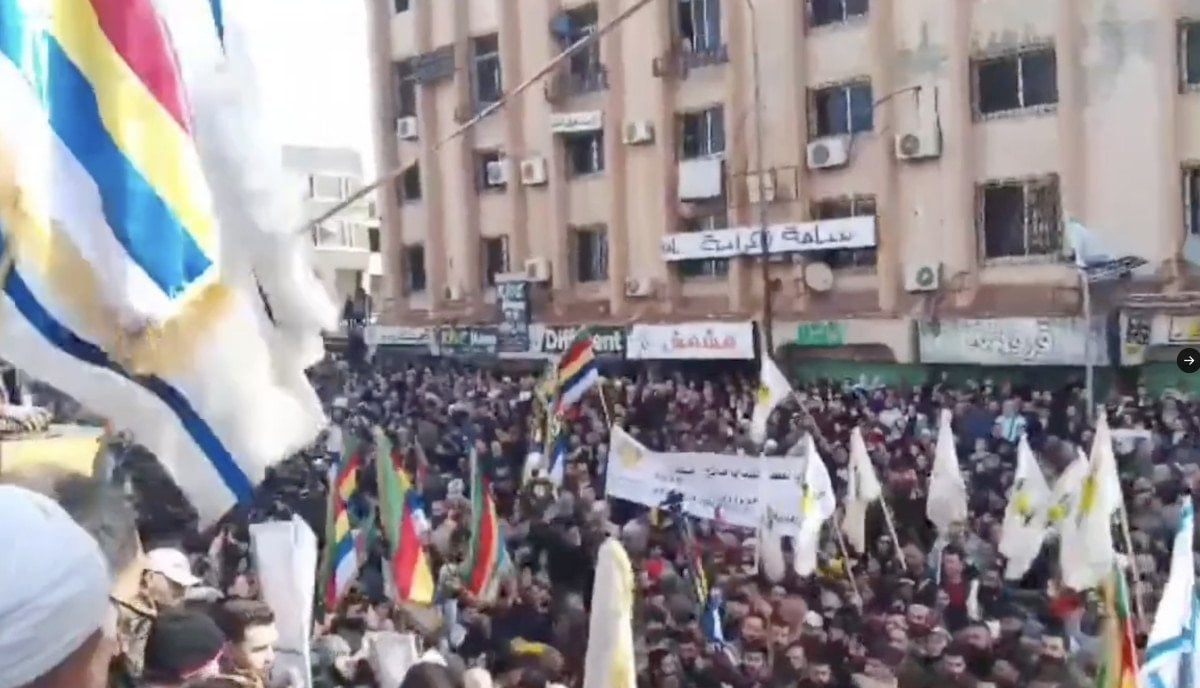 “Olmak ya da olmamak” sloganıyla düzenlenen gösteride Suriye Cumhurbaşkanı Ahmed Şara aleyhine sloganlar atıldı.