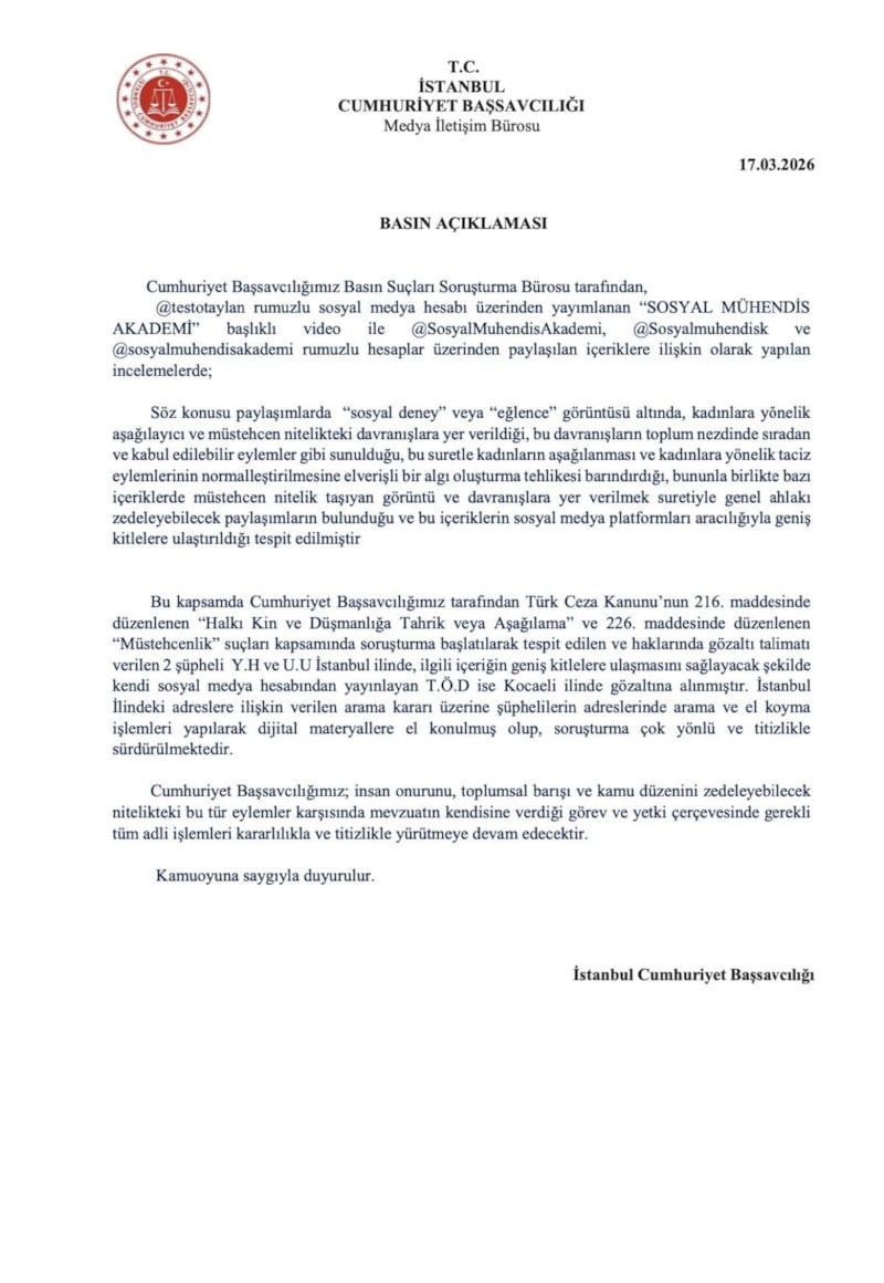 Soruşturmada “Sosyal deney” adı altında paylaşılan videolarda kadınlara yönelik aşağılayıcı ve müstehcen davranışlara yer verildiği, bu içeriklerin tacizi normalleştirebilecek nitelikte olduğu ve genel ahlakı zedeleyebileceği tespit edildi.