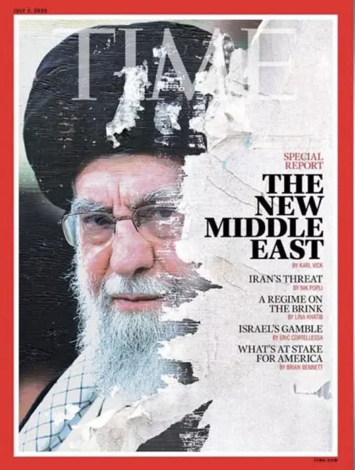 Aynı dergi daha önce Haziran 2025 sayısındaki kapağında kapağında Hamaney’i yüzü yırtılmış şekilde resmetmiş, İran’da rejim değişikliği iddialarının gündeme taşınmasına sebep olmuştu.