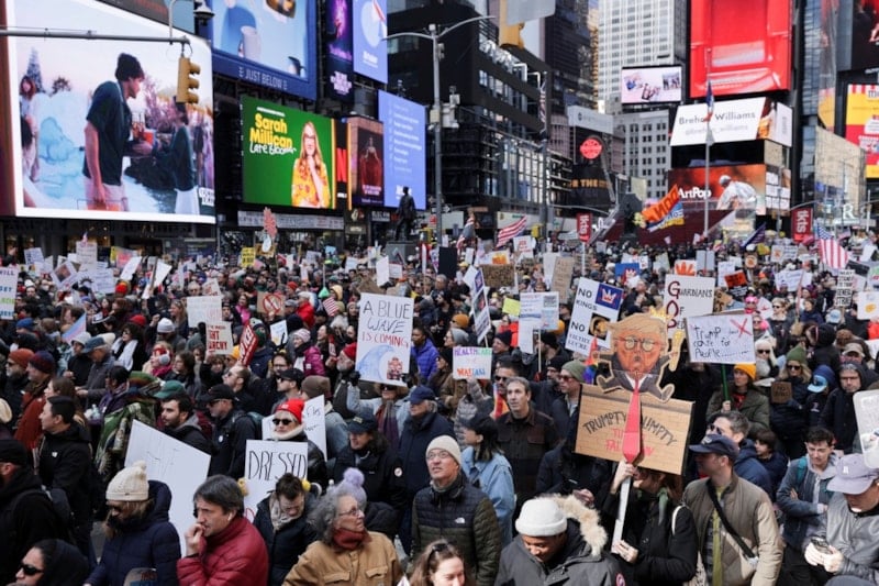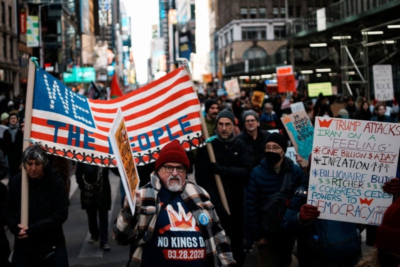 Ellerinde “Krallara hayır”, “İran’da ABD-İsrail savaşını durdurun”, “Trump gitmeli”, “Küba’ya ablukaya hayır”, “Epstein dosyalarında değilsen korna çal” yazılı pankartlarla bir araya gelen göstericiler, daha sonra 7. Cadde üzerinden çeşitli sloganlar atarak Times Meydanı’na doğru yürüyüşe geçti.
