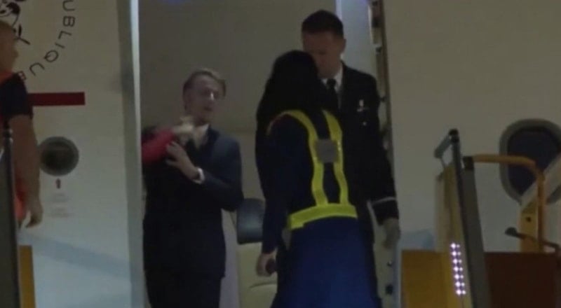 Uçak indikten sonra çıkışta bekleyen gazetecilerin önünde Macron ve eşi arasında tartışma çıktı.