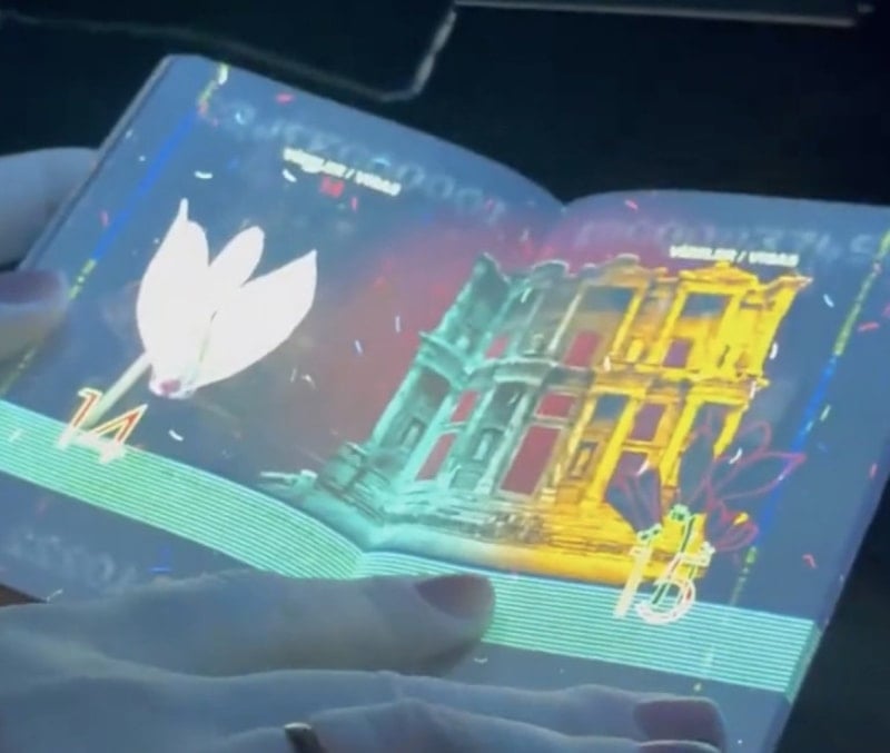 Türkiye Cumhuriyeti pasaportu sayfalarında bulunan hologramlar, uluslararası standartlarda hazırlanmış belgenin yüksek güvenliğini artırmak için kullanılan gelişmiş optik güvenlik unsurlar.