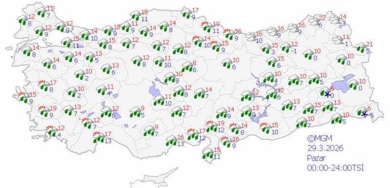 Hafta sonu Marmara, Ege, Akdeniz, İç Anadolu’nun güney ve batısı, Batı Karadeniz (Sinop hariç) ile Nevşehir, Çorum, Şırnak, Bitlis ve Siirt çevrelerinin yağmur ve sağanak; Van ve Hakkari çevrelerinin karla karışık yağmur ve yer yer kar yağışlı geçeceği tahmin ediliyor.