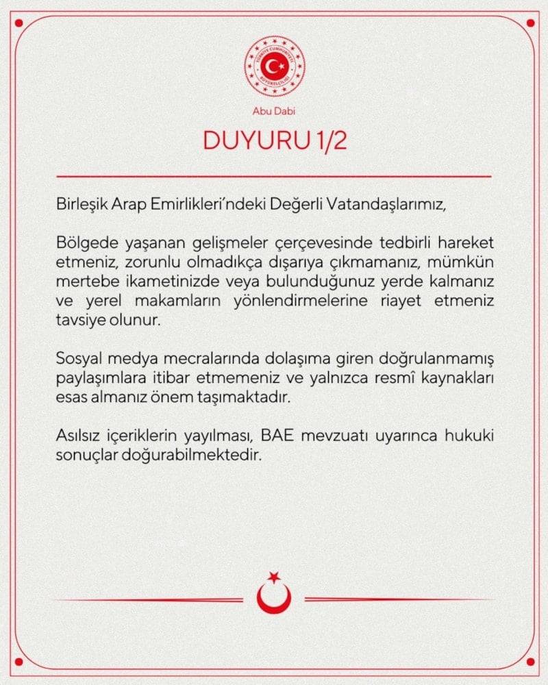 Türkiye’nin Abu Dabi Büyükelçiliği, bölgede güvenlik durumuna dikkat edilerek, zorunlu olmadıkça dışarı çıkılmaması, ikamet edilen yerde kalınması ve yerel makamların yönlendirmelerine uyulmasının önemine işaret etti. Sosyal medyada dolaşıma giren doğrulanmamış paylaşımlara itibar edilmemesi gerektiği vurgulandı.