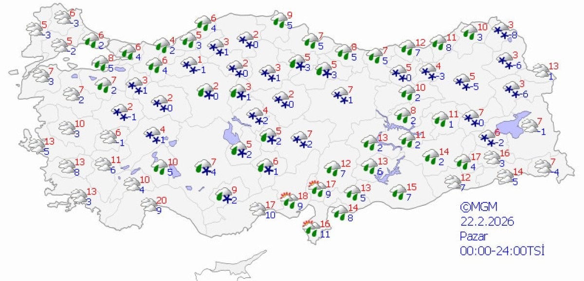 Güneydoğu Anadolu ve Akdeniz’in bazı bölgelerinde daha yüksek sıcaklıklar ve güneşli aralıklar devam ederken, Karadeniz, İç Anadolu, Doğu Anadolu ve Marmara’da kar yağışı ihtimali yüksek olarak değerlendiriliyor.