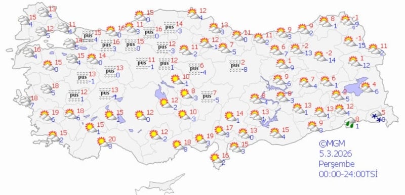 Bugün, yurdun batı ve iç kesimlerinde pus, sis ve düşük bulutluluk hakim.