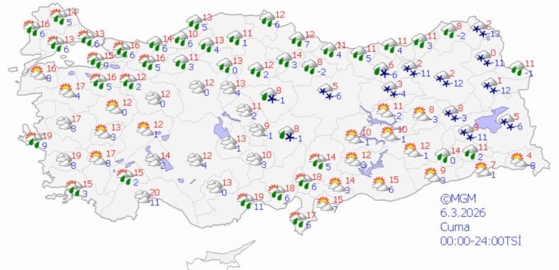 Cuma günü kar yağışının ve soğuk havanın iç ve doğu bölgelerde devam etmesi, batı kesimlerde sıcaklıkların artması bekleniyor.