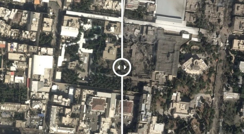 Uydu görüntülerine göre saldırıda en az 6 bina hasar gördü; en belirgin hasarın Hamaney’in konutunun bulunduğu bölgede gerçekleştiği aktarıldı.