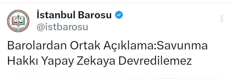 Aralarında İstanbul Barosu, Ankara Barosu, İzmir Barosu, Diyarbakır, Antalya, Bursa, Adana ve Konya barolarının da bulunduğu 78 baro, “Savunma hakkı yapay zekaya devredilemez” başlıklı ortak açıklama yayımladı.
