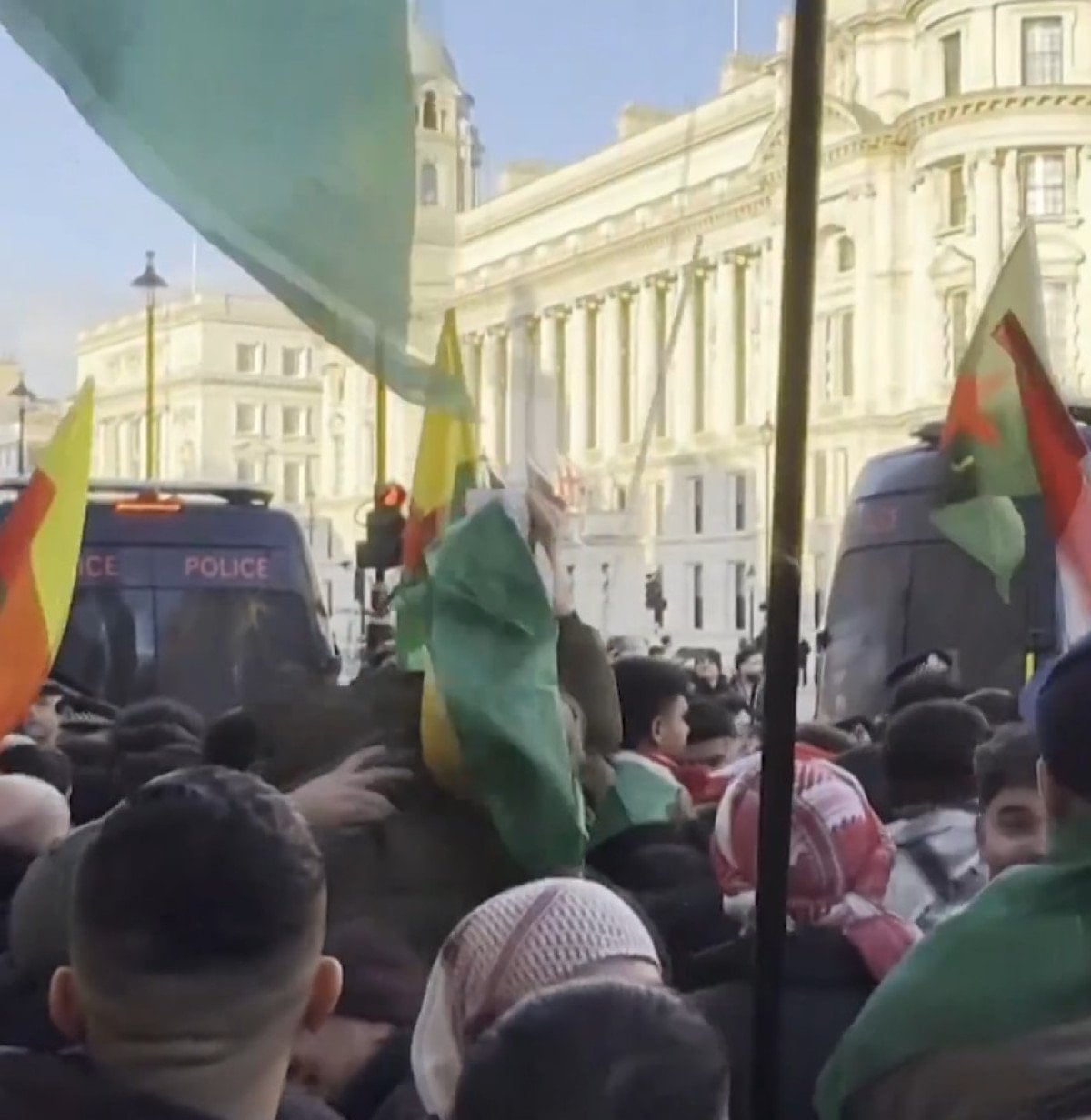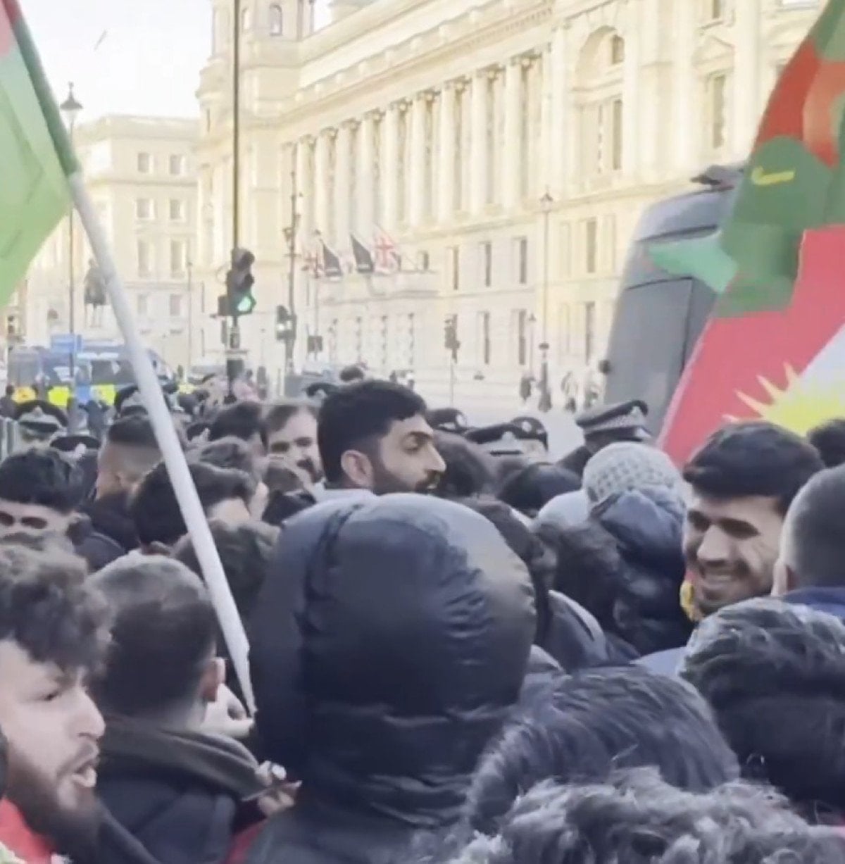 Polisin uyarısıyla tekrar Downing Sokağı girişindeki alana yönlendirilen YPG/SDG yandaşları, bir süre sonra Trafalgar Meydanı’na yürüyüşe geçmek istese de polis, bu yürüyüşe izin vermedi.