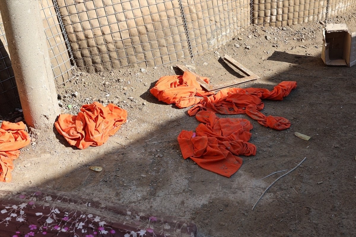 Terör örgütünce serbest bırakılan DEAŞ mensuplarının, tutuklulara giydirilen ve kaçarken çıkardıkları turuncu elbiseleri hapishanenin çevresine attığı görülüyor.